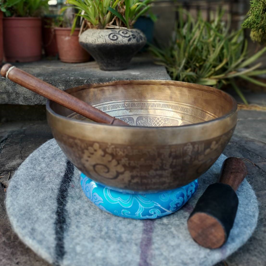 由金、銀、銅、鐵、錫、鉛、汞七種金屬組成的頌缽,是以喜馬拉雅山的隕石燒熔提煉再由手工打造而成。由頌缽發出的泛音聲響,能幫助身體放鬆,同時能平衡、調和人體的七個脈輪。