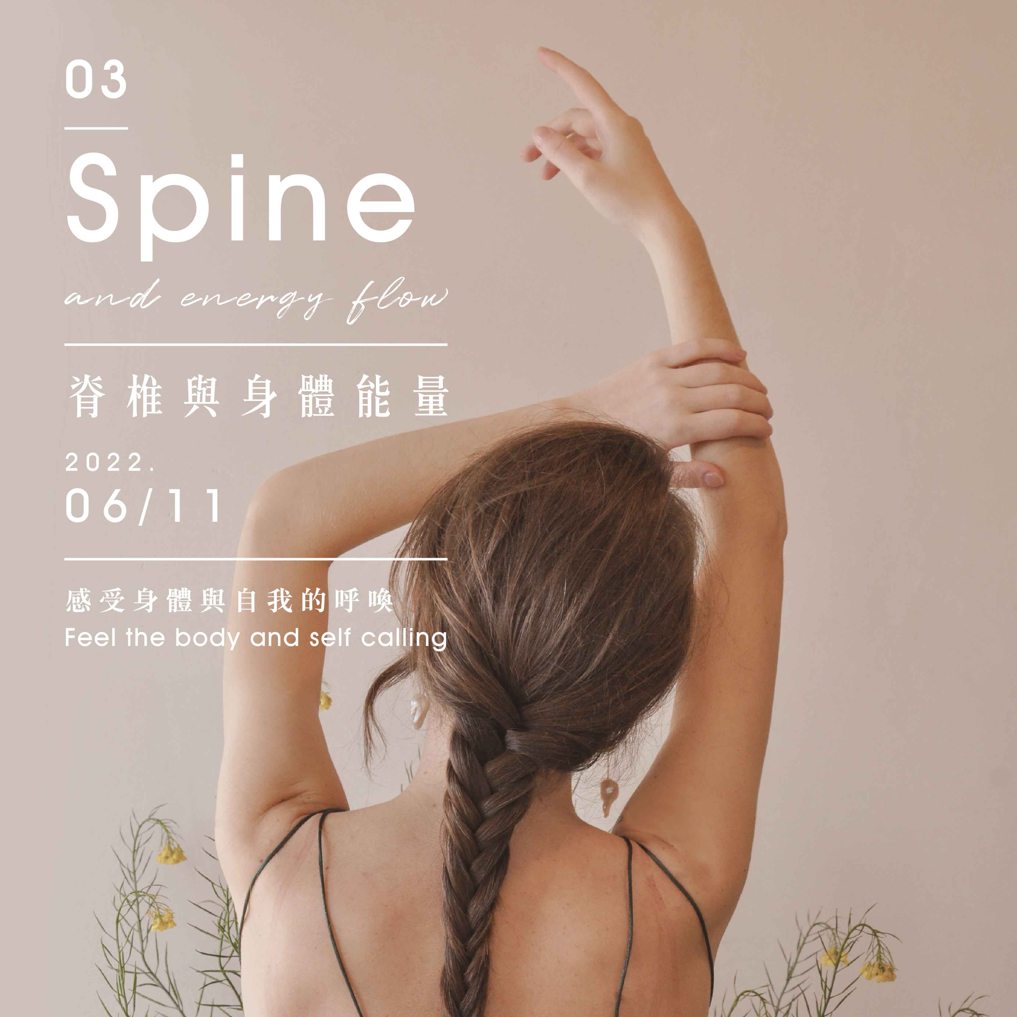 脊椎與流動:如何保有強壯堅固又敏銳靈活的身體架構,瑜珈是一個很好的應用,我們將從影響身體姿態的脊椎來感受自我生命的故事,整條脊椎與骨質的密度也訴說著我們年齡與靈魂的成長。而生命的能量也存在於第四腰椎骨內,適時的刺激與激活,將帶來生理的青春與精神的清醒,讓生命在流動中更加自由。