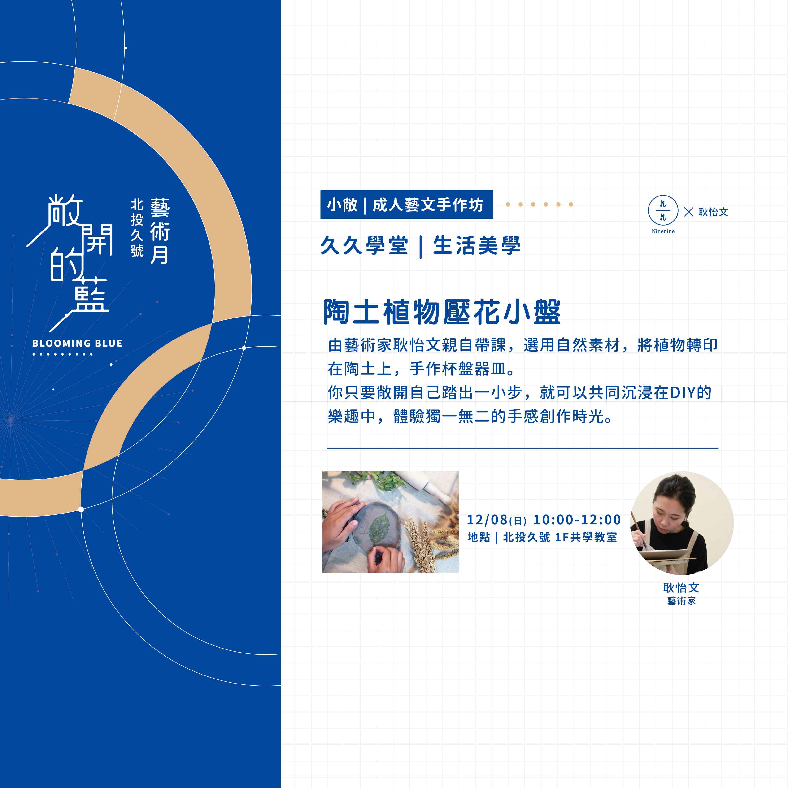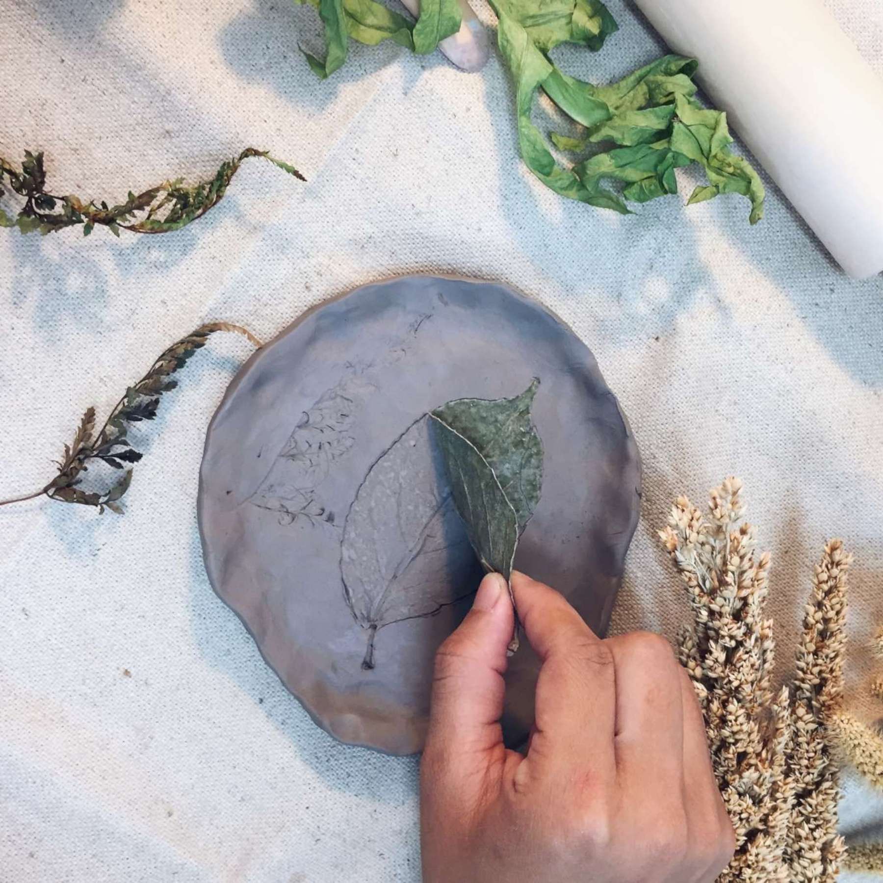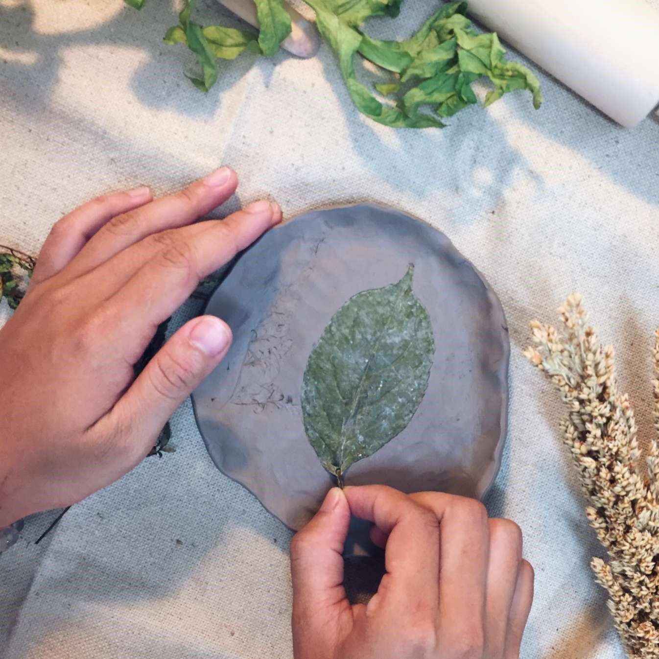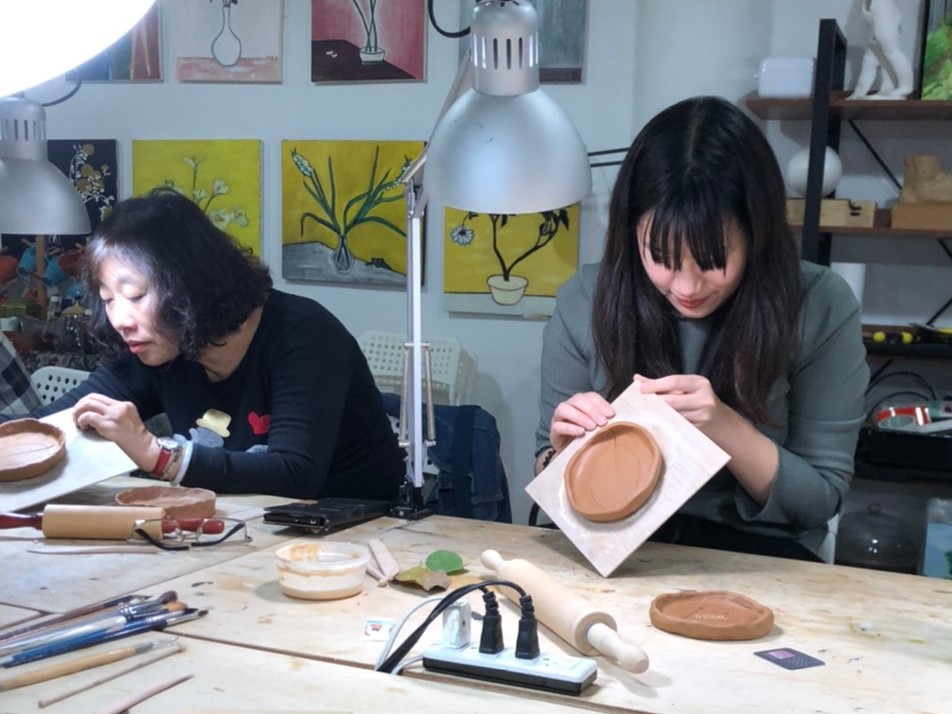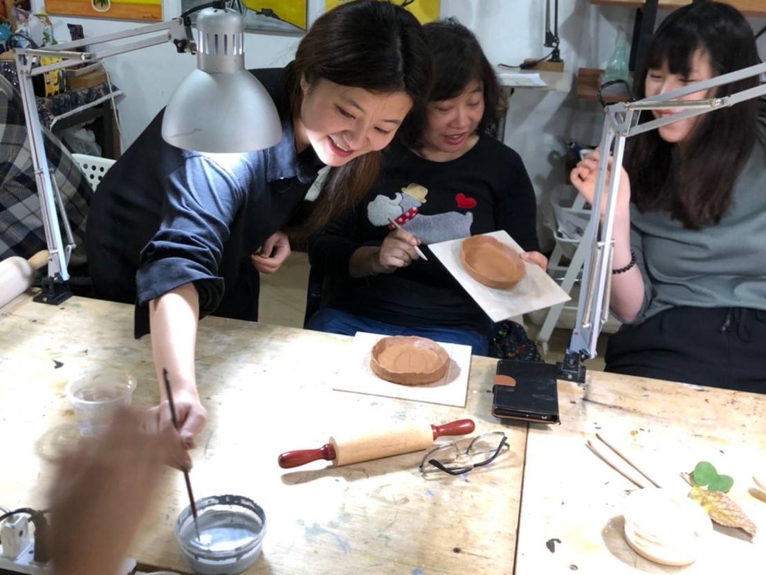 由藝術家耿怡文親自帶課,選用自然素材,將植物轉印在陶土上,手作杯盤器皿。